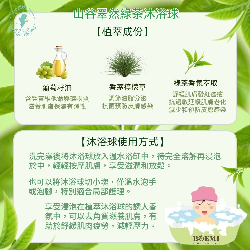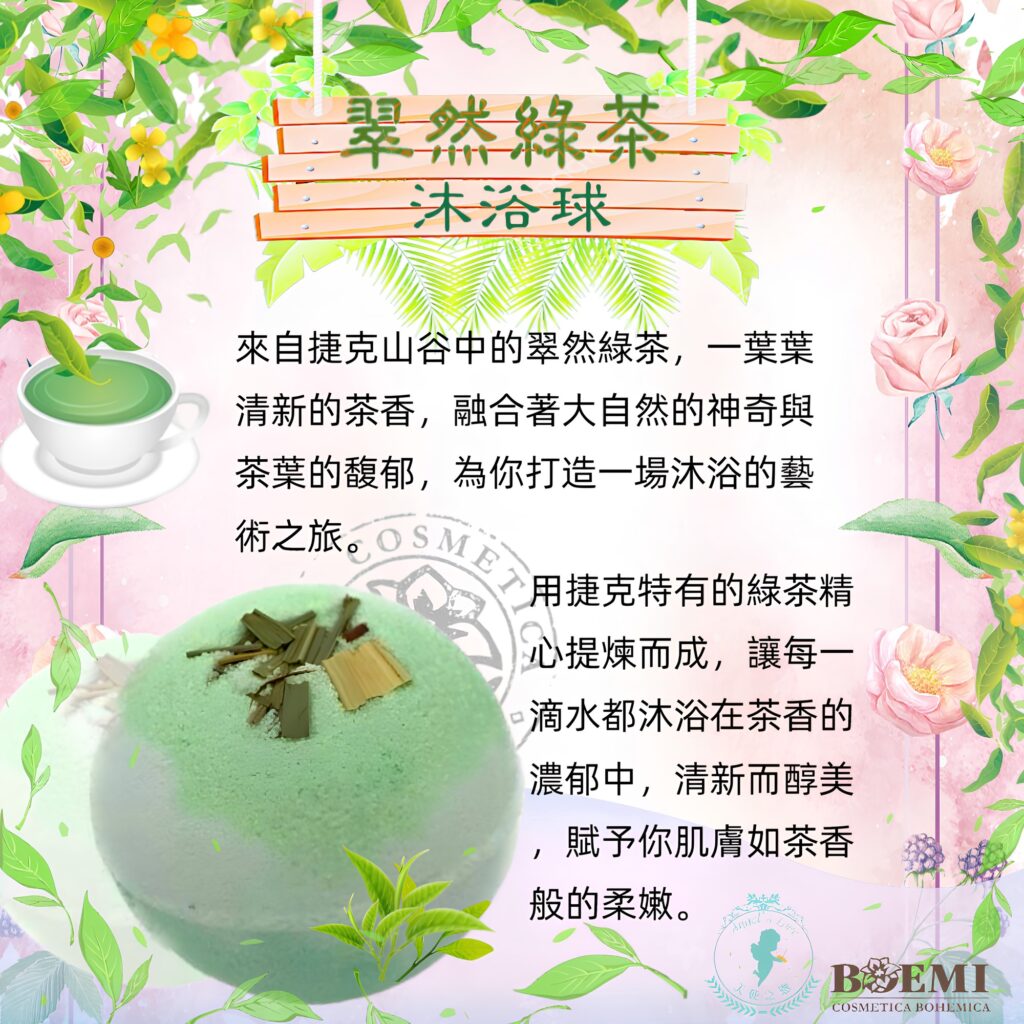 「捷克山谷翠然綠茶沐浴球」是手工製造,植萃果氛精油可療癒身心,男女老少都可享受泡澡歡樂。