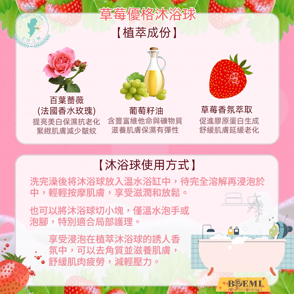 「歐風甜蜜草莓優格沐浴球」是手工製造,植萃果氛精油可療癒身心,男女老少都可享受泡澡歡樂。