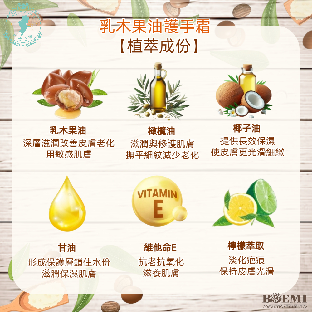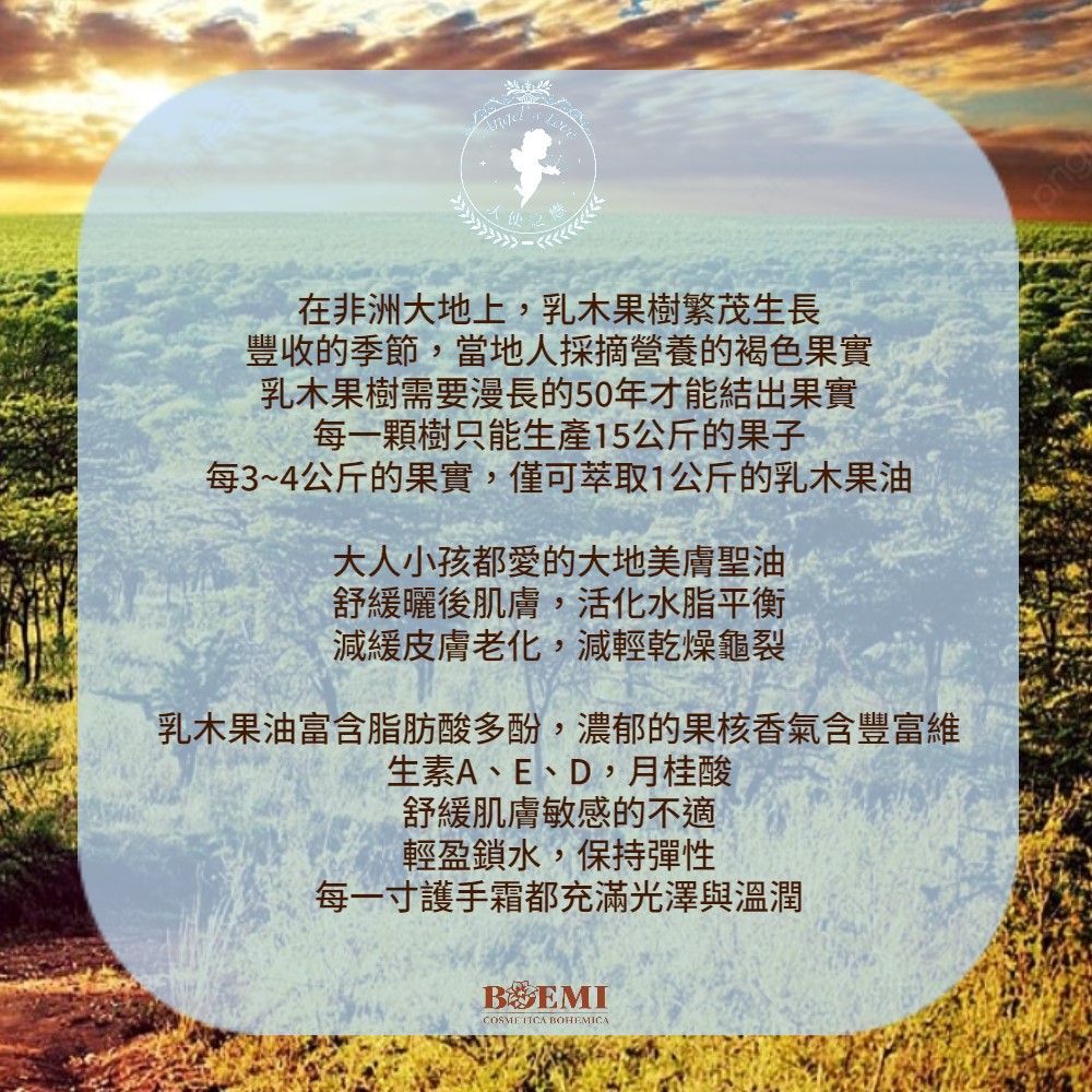 公克數:150ml 材料產地:非洲 / 製造地:捷克 商品描述: •原萃非洲護膚聖油果脂,滋潤防龜裂 •富含維生素E與植萃甘油,修復脫皮 •溫潤雙手的龜裂乾燥,柔嫩光澤肌膚 使用方法: 取適量均勻塗抹雙手,可針對乾燥的手背或指甲周圍肌膚多滋潤,搭配按摩可加速血液循環,輕柔搓揉,修護保濕顯光澤。