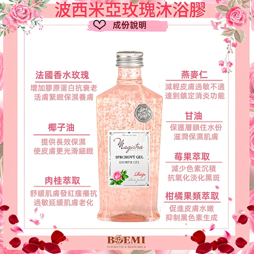 容量:250ml 產地:捷克 商品描述: •萃取玫瑰豐富保濕成份,平衡鎖住水份 •富含抗氧化劑可有效抗衰老使肌膚Q彈 •沐浴波西米亞天然玫瑰香氛,寵愛首選 使用方法: 將沐浴膠取適量倒在沐浴巾沾水搓揉起泡,再塗抹全身肌膚輕柔按摩,最後再以清水沖洗乾淨。捷克頂級沐浴膠採用天然植萃成份,不僅能有效清潔皮膚,還能同時提供深層保濕,讓肌膚保持柔軟和滋潤,溫和不刺激,適合各種膚質使用。