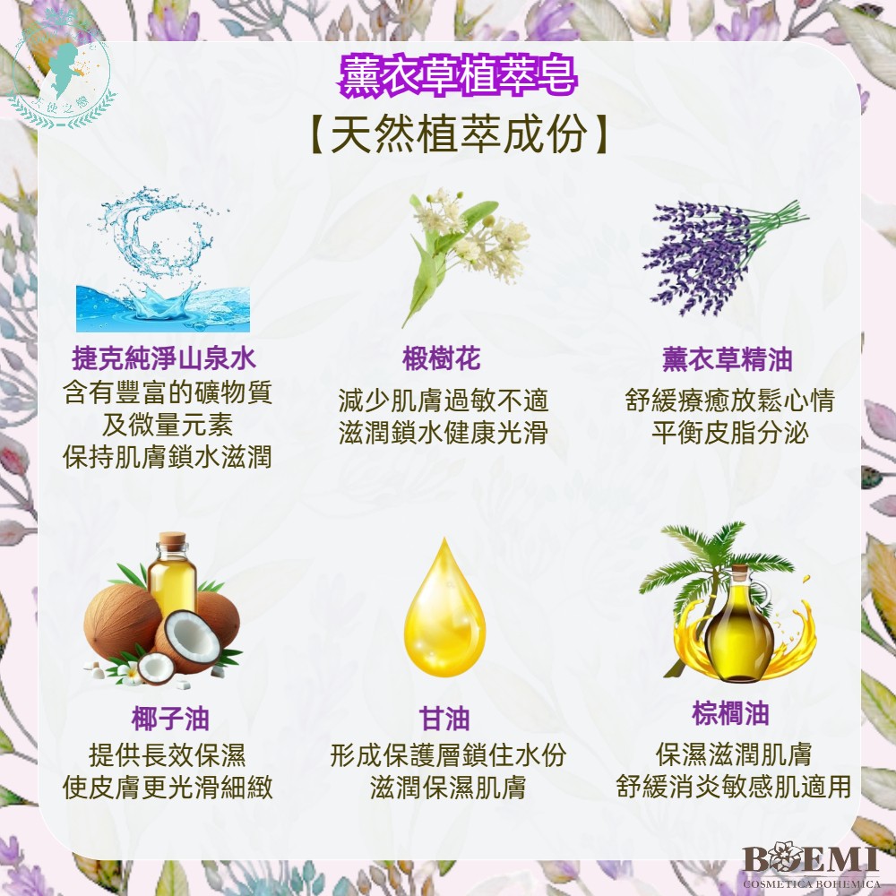 公克數:210g 產地:捷克 商品描述: •萃取薰衣草菁華花植,香味輕柔溫潤 •沐光在南法普羅旺斯薰衣草田園陽光 •恬美深層滋潤嫩肌,純粹亮澤肌膚 使用方法: 以微濕的雙手、浴球、絲瓜絡或海綿,搓揉起泡,溫柔潔淨身體肌膚,再以清水洗淨,洗後柔潤舒適不乾澀,同時滋養肌膚,成份天然有機,適合全家大小使用。